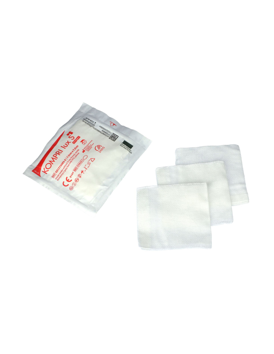 Kompresy jałowe KOMPRI lux S wykonane są z hydrofilowej gazy bawełnianej, bielonej metodą bezchlorową z wodą utlenioną. Charakteryzują się podwójnie podwijanymi brzegami (składanie typu „ES”), które zapobiegają wysnuwaniu się włókien. Idealne jako gaziki jałowe, opatrunki jałowe i kompresy jałowe do ogólnego opatrywania ran, mocno chłonne, miękkie i wytrzymałe. Dostępne w różnych rozmiarach i wariantach nitkowych (z nitką kontrastującą na RTG lub bez). Produkt jednorazowego użytku, pakowany w jałowe opakowania typu blister.