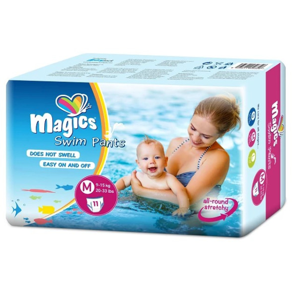 MAGICS Swimpants M to wysokiej jakości pieluchy do pływania dla dzieci ważących 9–15 kg, czyli zwykle od 1 roku życia. Idealne pieluszki do pływania na basen, plażę czy jezioro, doskonale sprawdzają się podczas nauki pływania i wodnych zabaw. Dzięki wodoodpornej budowie pielucha na basen nie puchnie i nie obciąża dziecka, zapewniając komfort i swobodę ruchów. Łatwe do zakładania, wyposażone w boczne szwy do szybkiej zmiany, spełniają wysokie wymogi higieniczne obiektów basenowych. Kolorowy design jest unisex, odpowiedni dla chłopców i dziewczynek. Opakowanie zawiera 11 sztuk.