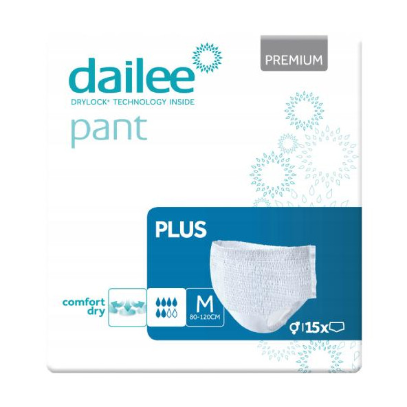 Dailee Pant Premium Plus to majtki chłonne nowej generacji, odpowiednie dla kobiet i mężczyzn z umiarkowanym lub ciężkim nietrzymaniem moczu. Dzięki chłonności 6/8 kropli (ok. 1400 ml) zapewniają skuteczną ochronę przez cały dzień i noc. Wykonane z elastycznego, oddychającego materiału, z anatomicznym krojem, oferują dyskrecję i komfort na poziomie zwykłej bielizny.